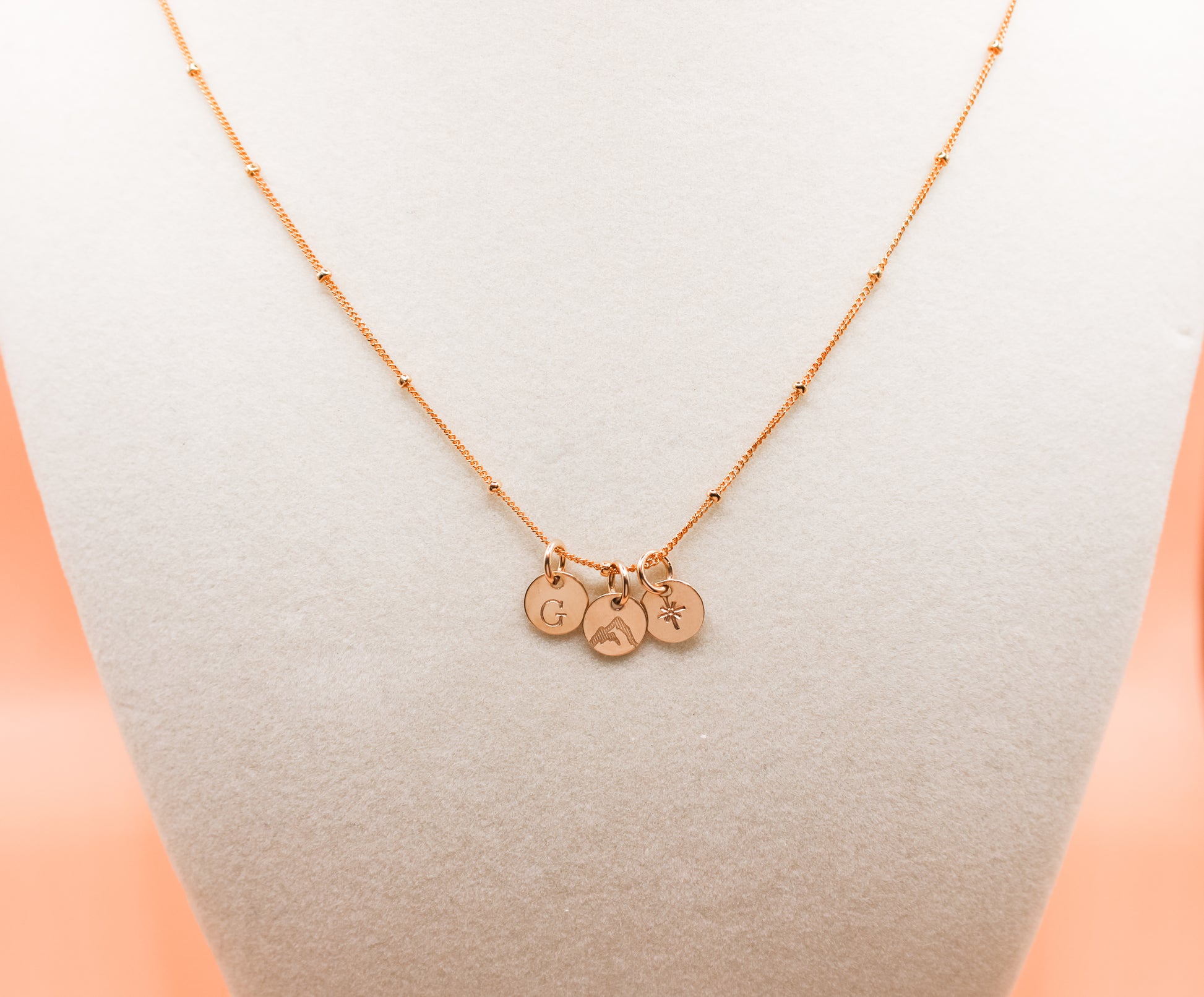 Add personalized gold-filled discs to your necklace to make it a stacker necklace. On the cart page, make sure to write in the notes section which necklace you would like the extra discs added to and in the order you would like them. If it is not specified where the stackers are supposed to be added in the notes section, they will be sent unattached, and you will have to add them to your piece using a small pliers. Stacking discs may only be added to regular chain, satellite chain, and box chain.