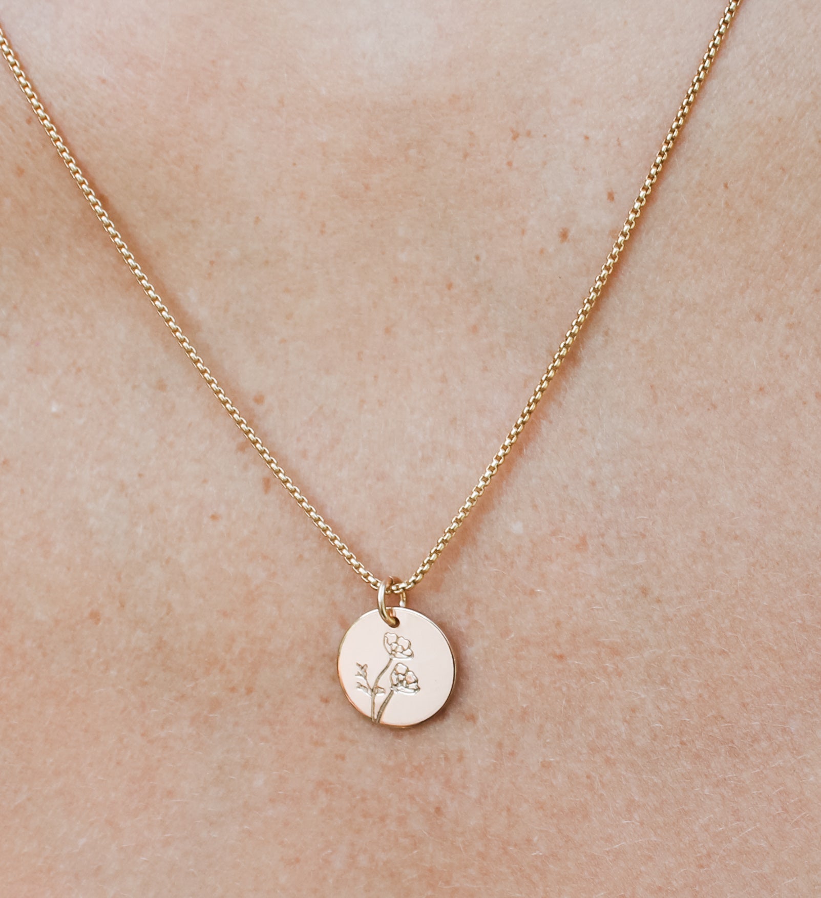 Customize this necklace for yourself or someone special by personalizing the large gold-filled or sterling silver disc with the birth flower of your choice. Wear this as a single disc or a stacker.