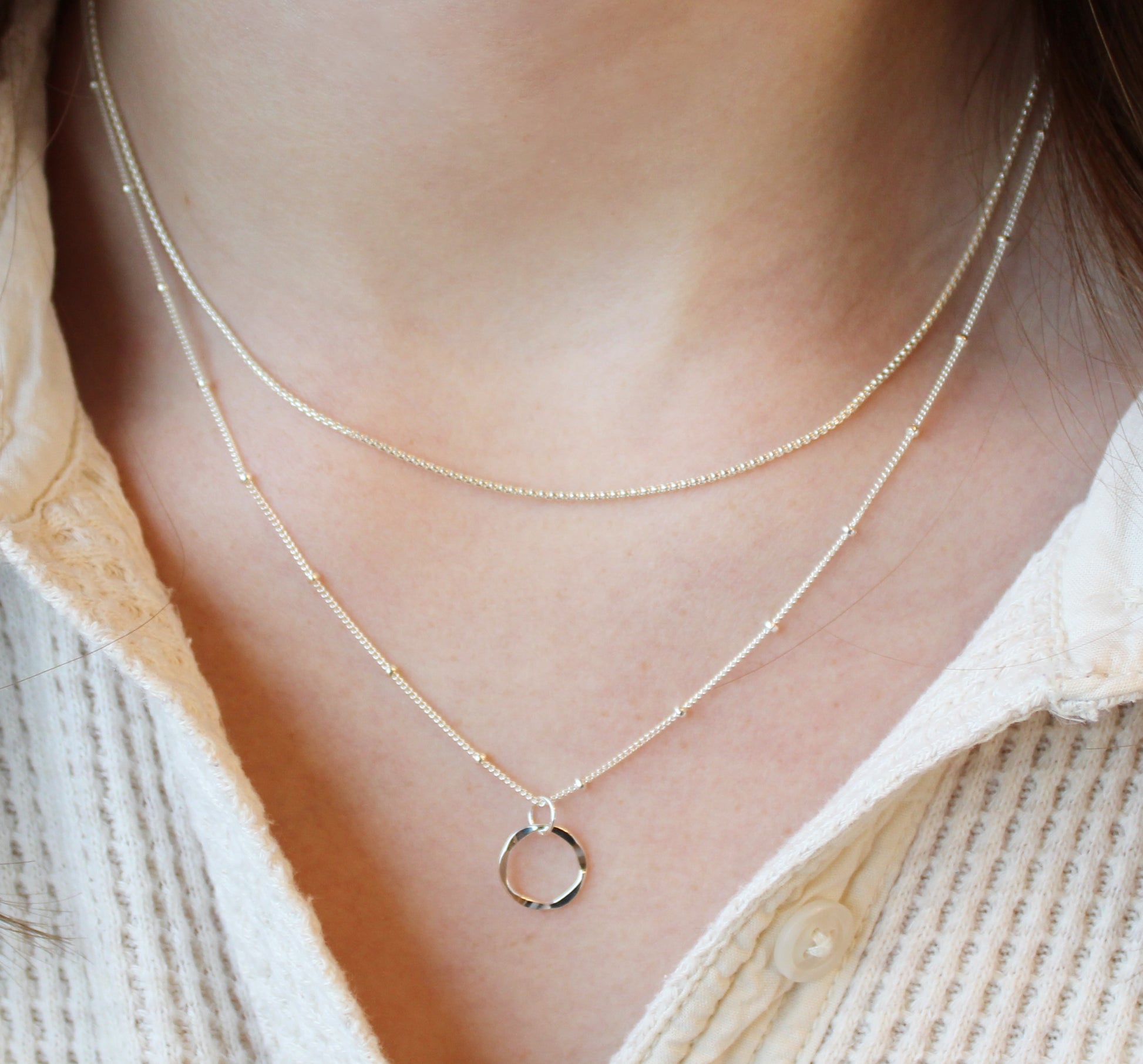 This beautiful sterling silver necklace highlights a wavy and imperfect, yet whole, circle. It is a beautiful symbol to remind us that though we all have rough edges, we have the hope of being complete and whole. This beautiful necklace reminds us of the sacred promise that “All things will be made beautiful in His time” (Ecclesiastes 3:11).